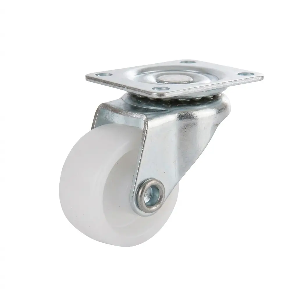 La roue pivot polyamide à plaque 50 mm blanche est conçue pour garantir un roulement fluide et sans effort. Sa faible résistance au démarrage permet un déplacement doux et silencieux, même sous charge.
